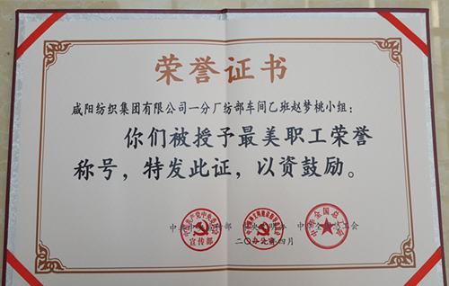 在“五一”國(guó)際勞動(dòng)節(jié)來(lái)臨之際,中央宣傳部、中央文明辦、全國(guó)總工會(huì)聯(lián)合向全社會(huì)公開(kāi)發(fā)布全國(guó)10位“最美職工”的先進(jìn)事跡。咸陽(yáng)紡織集團(tuán)有限公司一分廠趙夢(mèng)桃小組榮獲全國(guó)10位“最美職工”中唯一一個(gè)班組集體代表稱(chēng)號(hào),受到了全國(guó)、省、市總工會(huì)、中紡政研會(huì)、陜紡政研會(huì)、陜西省、咸陽(yáng)市等各級(jí)組織的高度重視和一致祝賀。趙夢(mèng)桃小組現(xiàn)任生產(chǎn)組長(zhǎng)王曉榮在北京參加了“最美職工”發(fā)布會(huì)頒獎(jiǎng)儀式,趙夢(mèng)桃小組8名組員受邀參加了中央電視臺(tái) “中國(guó)夢(mèng)、勞動(dòng)美”“五一”特別節(jié)目的錄制。4月26日,中央新聞聯(lián)播、新華社、新華網(wǎng)、中宣部、中國(guó)文明網(wǎng)、全國(guó)總工會(huì)網(wǎng)等主流媒體均發(fā)布報(bào)道了“最美職工”概況及發(fā)布會(huì)實(shí)況。