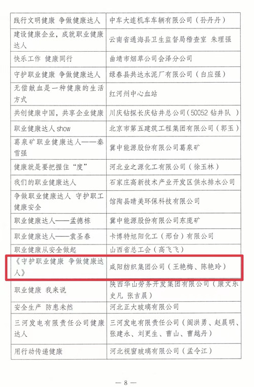 | 近日,全國(guó)總工會(huì)“喜迎黨的二十大 職業(yè)健康Show起來(lái)”為主題的“職業(yè)健康達(dá)人”Show短視頻征集活動(dòng)評(píng)選結(jié)果揭曉,咸陽(yáng)紡織集團(tuán)工會(huì)選送的作品《守護(hù)職業(yè)健康 爭(zhēng)做健康達(dá)人》榮獲三等作品。
